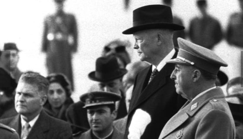 During that period, Spain was not a member of NATO. But that was for cosmetic reasons. In 1953, the United States and Spain signed the Pact of Madrid. This gave the US five bases in Spain in return for economic and military aid to the Franco regime. Far from being a pariah, General Franco even hosted a state visit by US president Dwight Eisenhower in 1959.